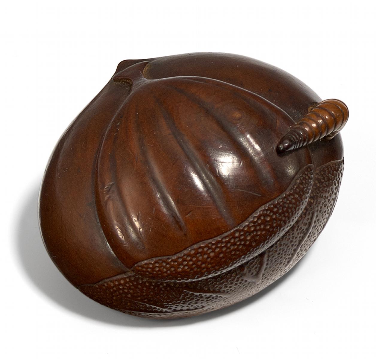 Beschreibung: Eine große und eine kleine Kastanie aufeinanderliegend, dazu ein Wurm, dessen Ende aus der