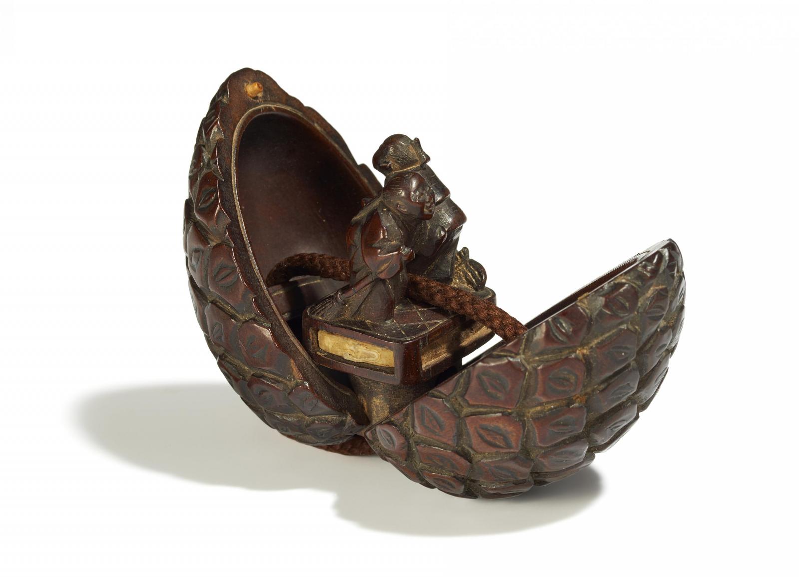 NETSUKE: KIEFERNZAPFEN MIT DEM PAAR VON TAKASAGO.