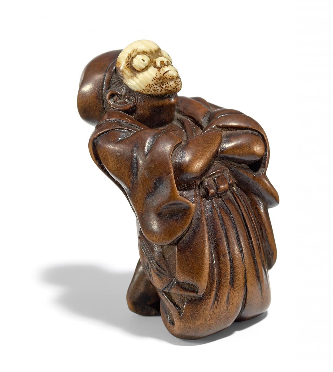 Beschreibung: Mit verschränkten Armen in weitem Falten-Gewand trägt dieser eine Affen-Maske aus