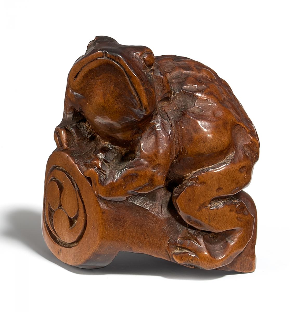 NETSUKE. KRÖTE AUF DACHZIEGEL. BUCHBSBAUM.
