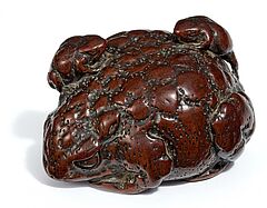 NETSUKE. KRÖTE MIT ZWEI JUNGEN. OBSTHOLZ. SIGN.: TAMETAKA.