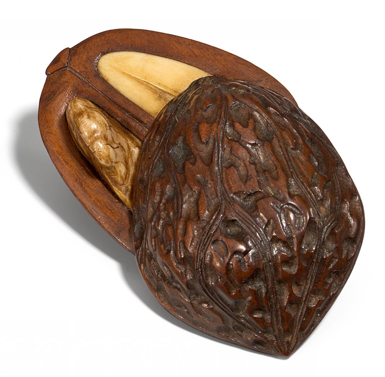 Technik: Buchsbaum, fein geschnitzt, graviert und dunkel akzentuierte Blattnarben, die rote Frucht eingelegt aus rotem Glas.