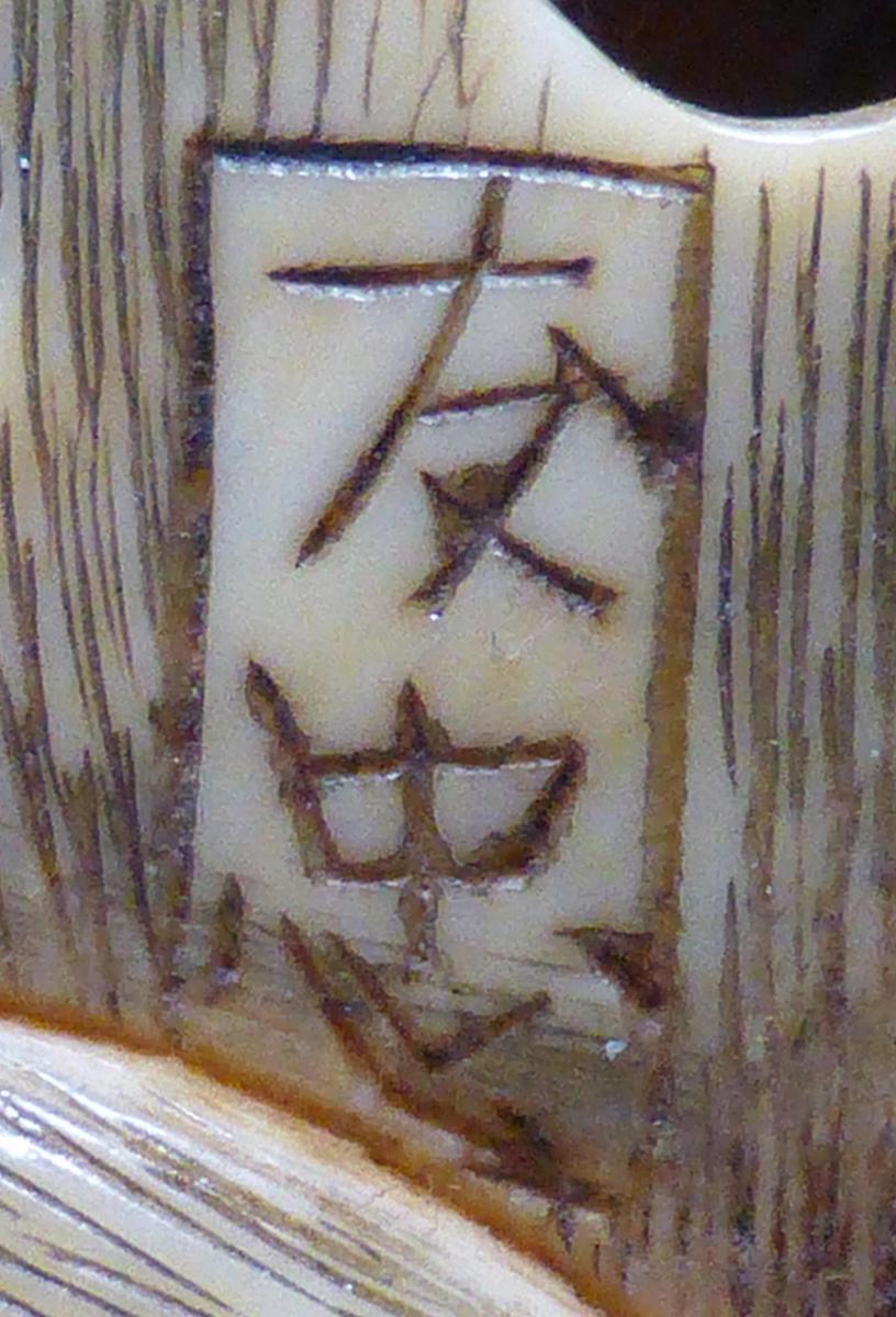 Technik: Elfenbein mit graviertem und leicht eingefärbtem Fell. Bei einem Auge Einlage in dunklem Horn, das andere wohl ersetzt.