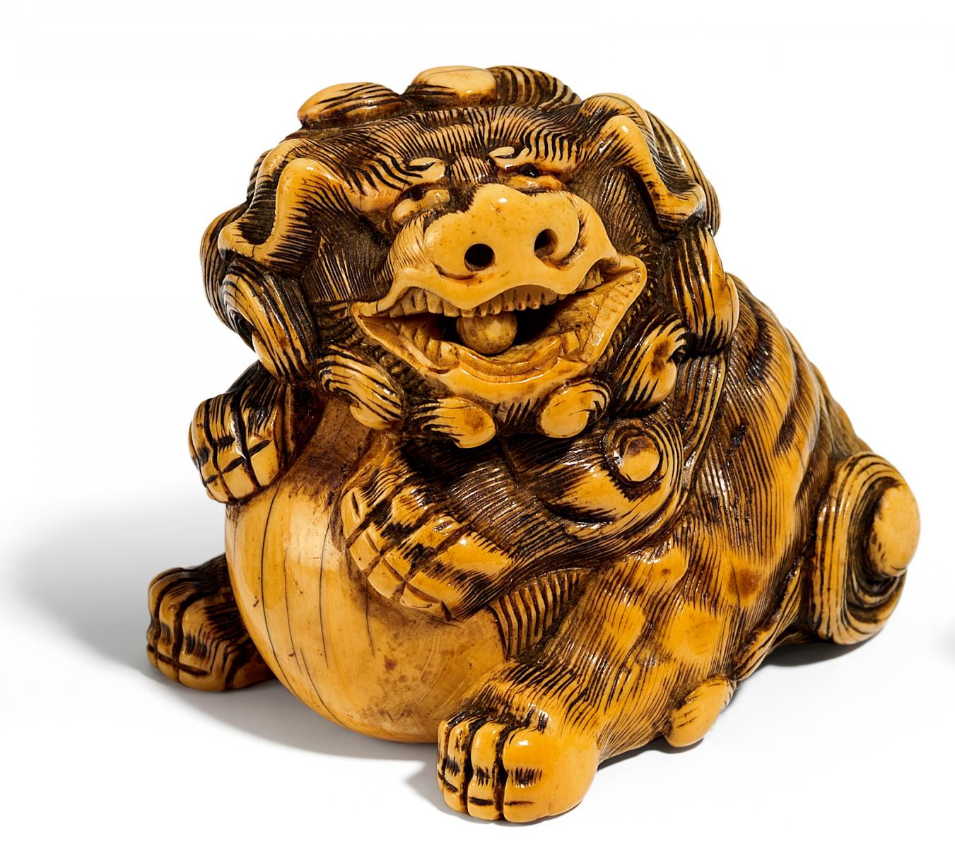 Technik: Elfenbein, kräftig geschnitzt, graviert und dunkel akzentuiert, die Augen sind eingelegt aus dunklem Horn. Rundherum schöne, gold-gelbe Patina, einige Spuren roter Einfärbung.
