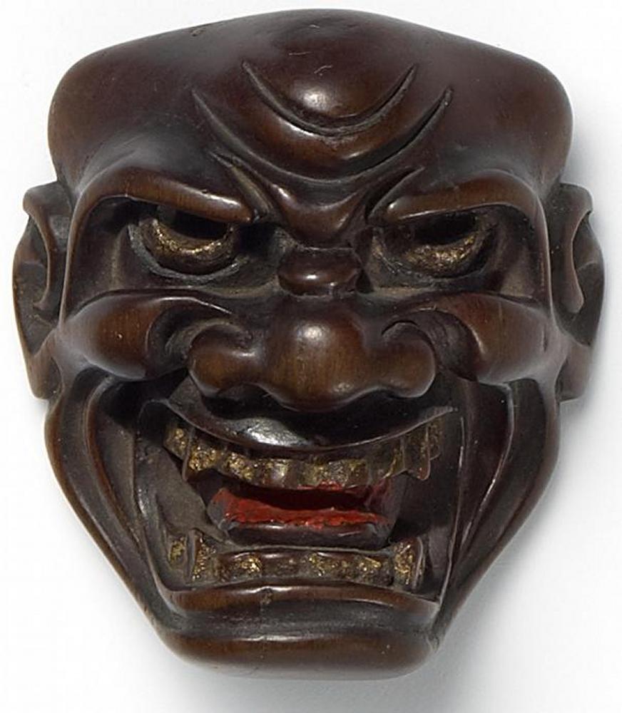 NETSUKE: MASKE EINES DÄMON, TOCHINOKI UND LACK.