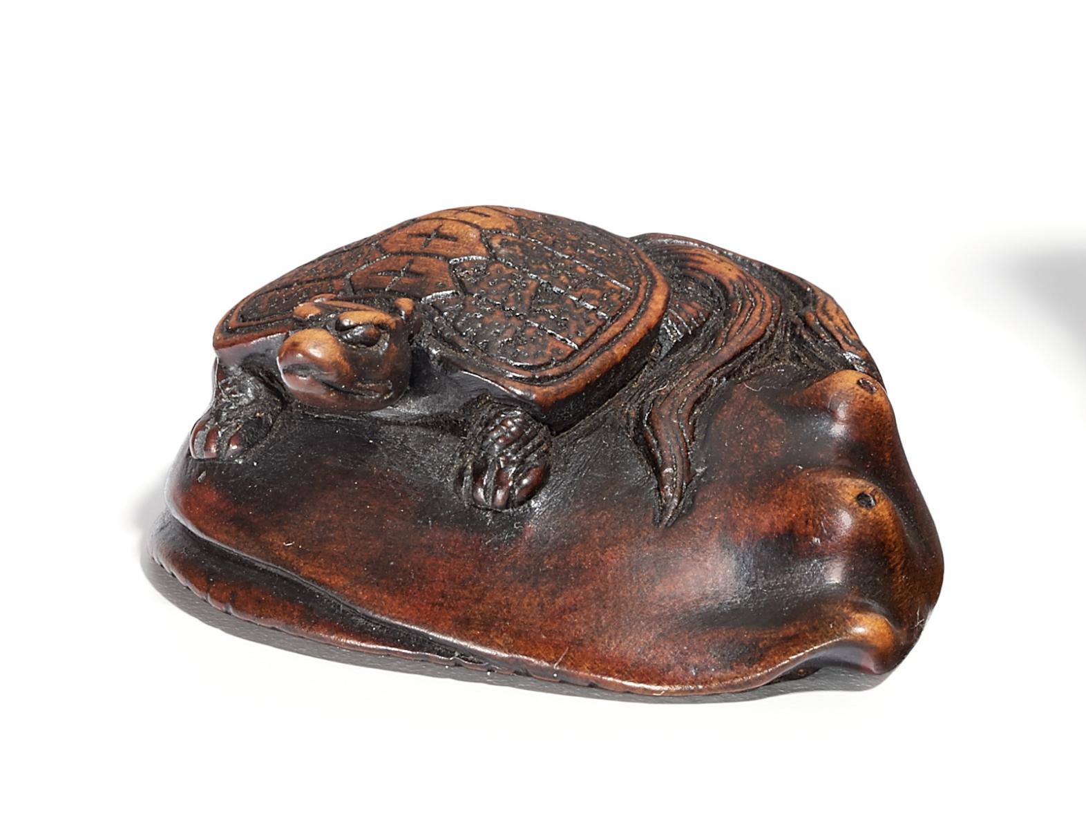 NETSUKE. MINOGAME AUF AWABI-MUSCHEL. MAGNOLIEN-HOLZ. SIGN.: MASAMITSU.
