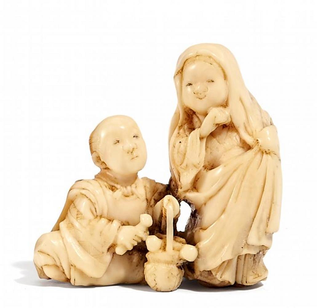NETSUKE. OKAME BEIM KAUF VON PHALLUS-PILZEN. MARINES ELFENBEIN. SIGN.: SHOUNSAI.