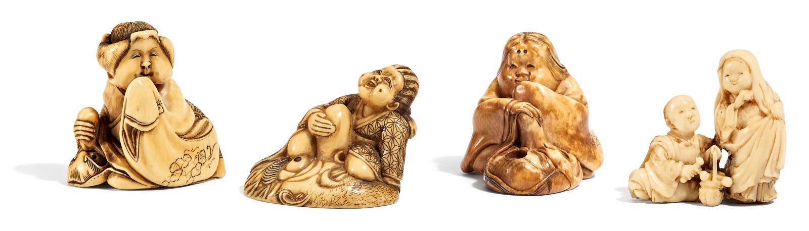 NETSUKE. OKAME KNIEEND MIT TENGU-MASKE. ELFENBEIN.