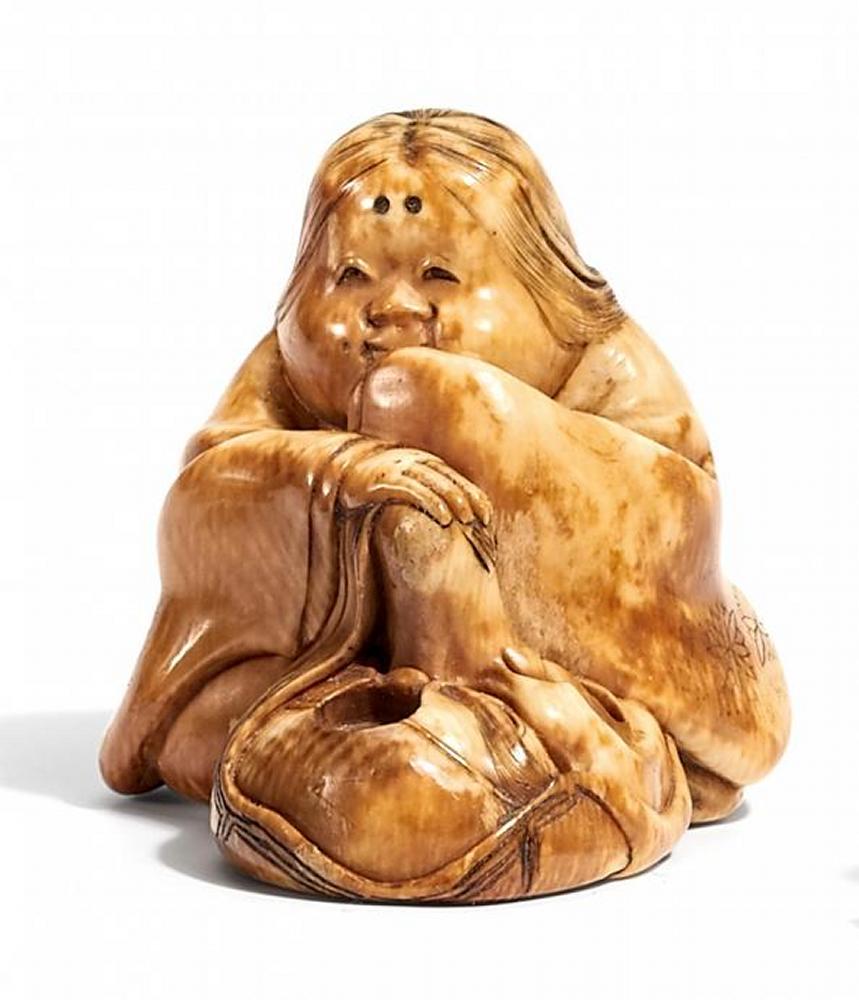 NETSUKE. OKAME MIT TENGU-MASKE IN TUCH. ELFENBEIN. SIGN.: KÔGYOKU.