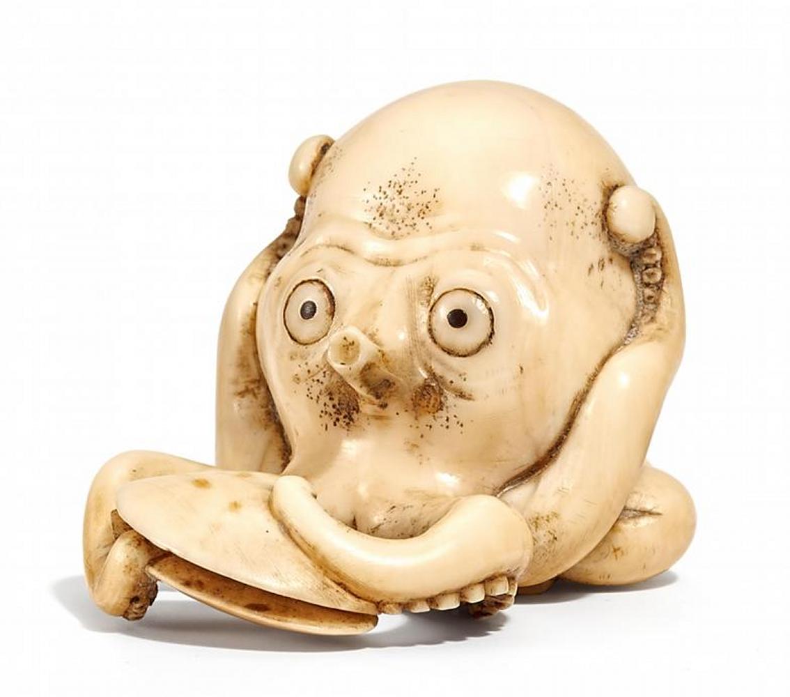 NETSUKE. OKTOPUS MIT VENUSMUSCHEL. HIPPOPOTAMUS-ZAHN. SIGN.: MASATOMO.