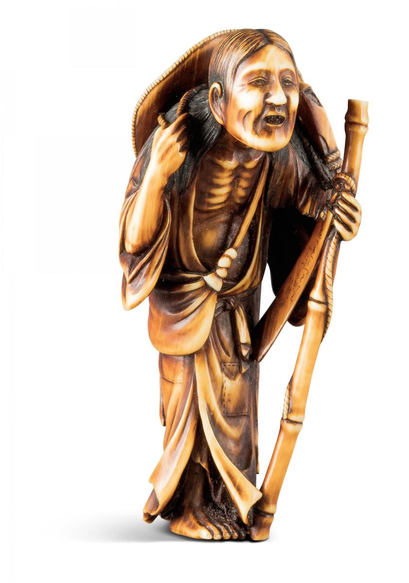 Technik: Elfenbein mit sehr fein geschnitzten und gravierten Details, fein patiniert.