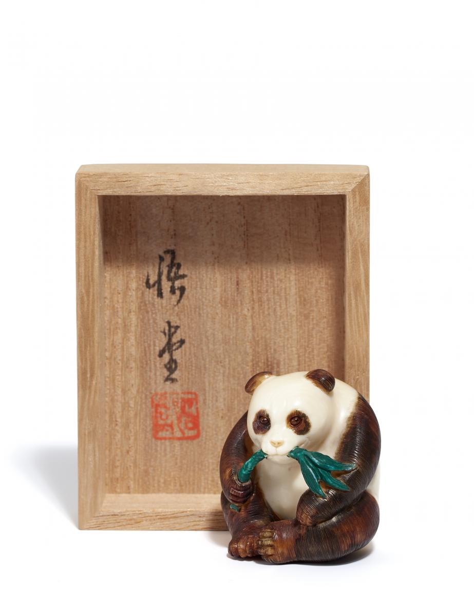 NETSUKE. PANDA MIT BAMBUSZWEIG. BEIN. SIGN.: GODO (GOICHIRO ABE GODO, *1914).