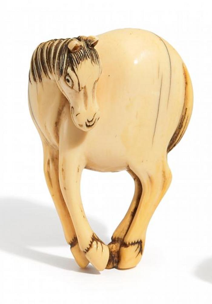 NETSUKE. PFERD STEHEND MIT ALLEN VIER HUFEN ENG BEISAMMEN. ELFENBEIN.