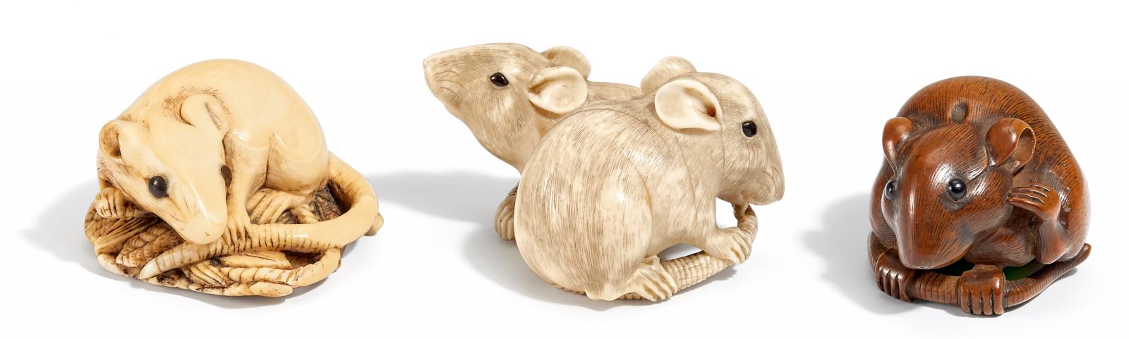 NETSUKE. RATTE AUF BLÄTTERN. HIPPOPOTAMUS-ZAHN.