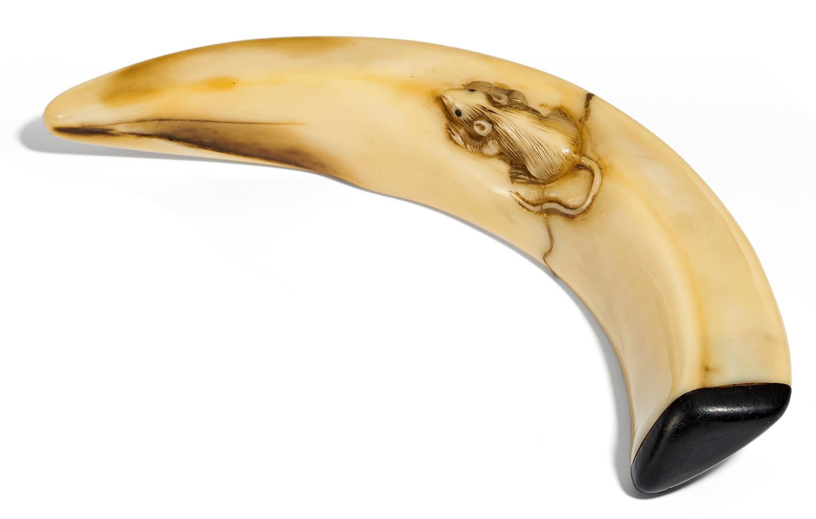 Zustand A/B. Der Hauer war vor dem Schnitzen gerissen, der Riss wurde mit Goldlack befestigt und danach geschnitzt.