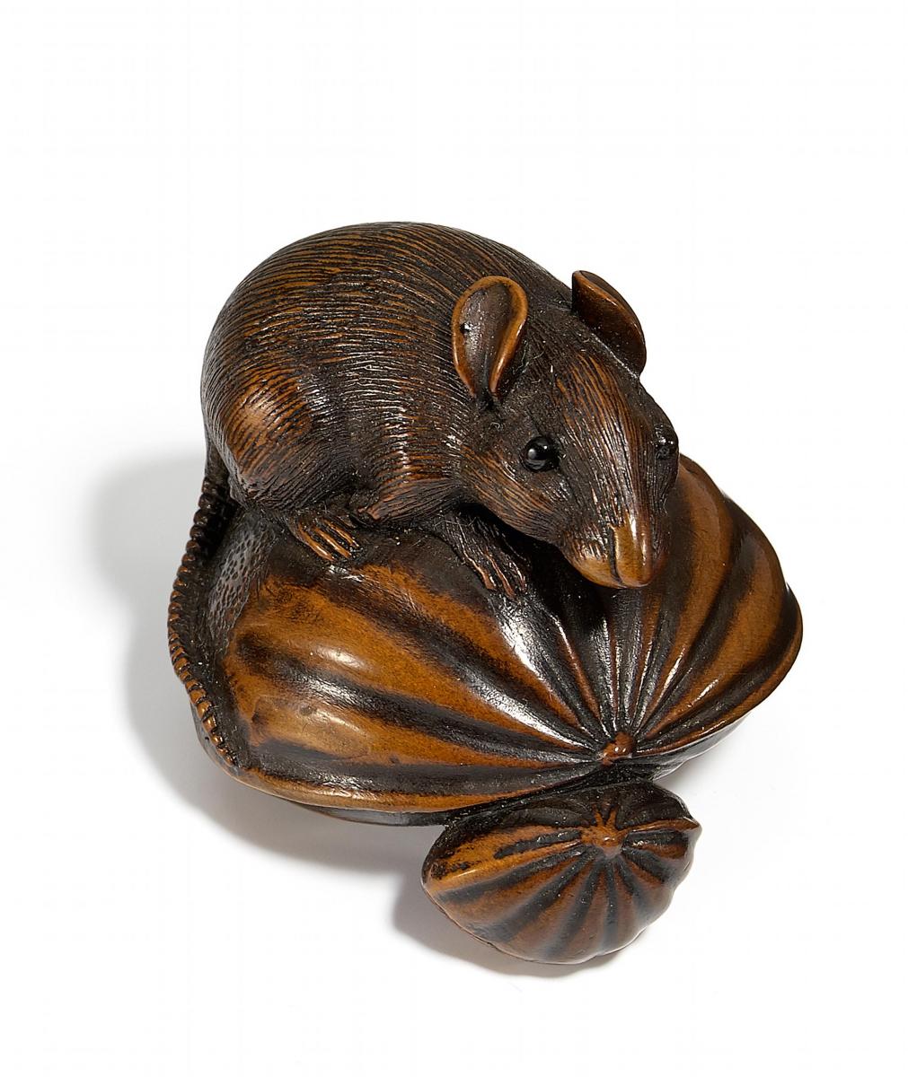 NETSUKE: RATTE SITZEND AUF GROßER KASTANIE.