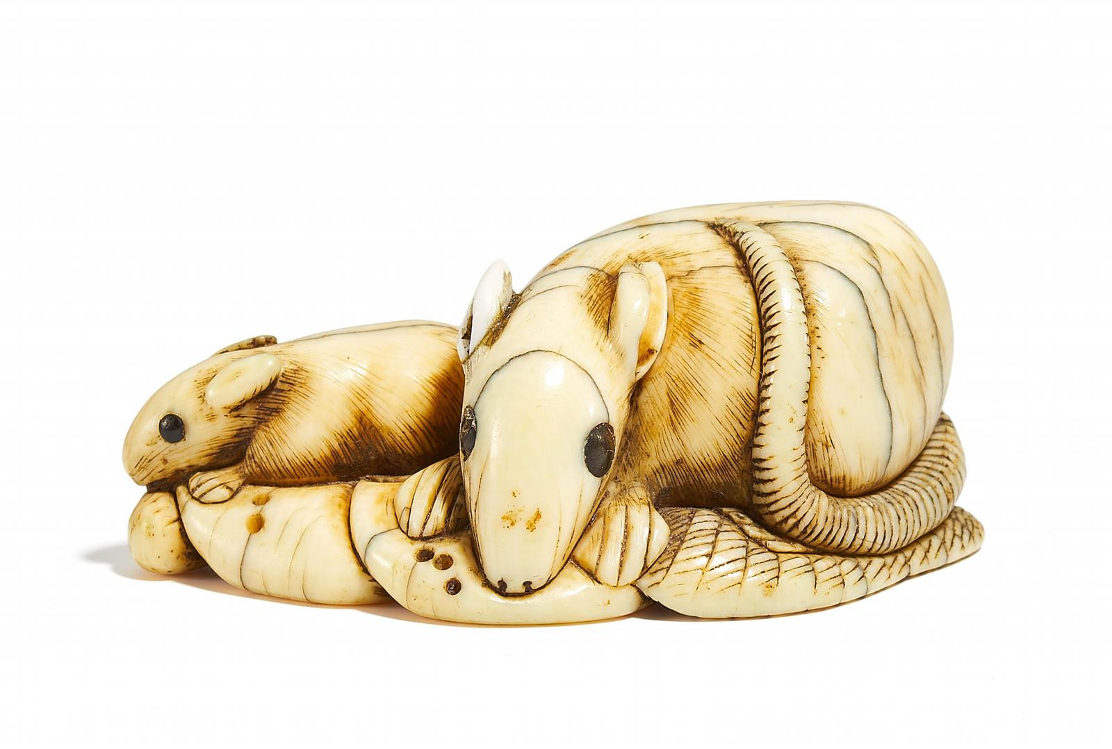 NETSUKE: RATTENMUTTER MIT JUNGEM AUF PILZEN UND BLATT.