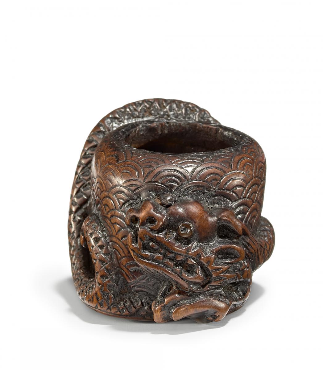 NETSUKE. REGENDRACHE. DUNKEL PATINIERTES HOLZ. SIGN.: TOMOTSUGU.