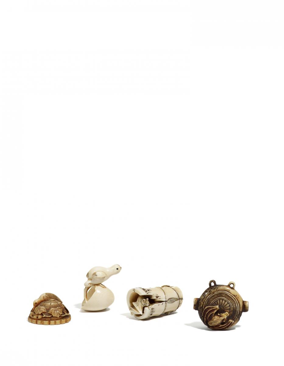 NETSUKE: REIHER AUF VEROTTETEM HUT, ELFENBEIN.