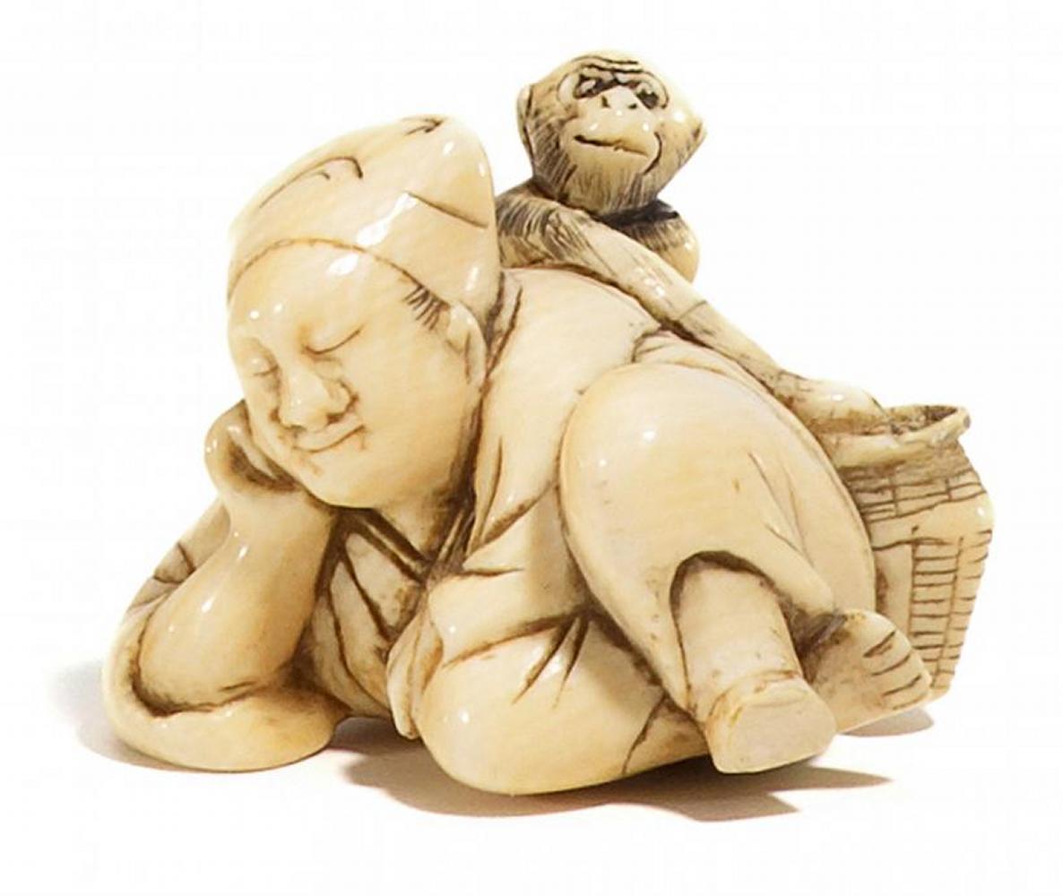 NETSUKE: SARUMAWASHI MIT AFFE, ELFENBEIN.