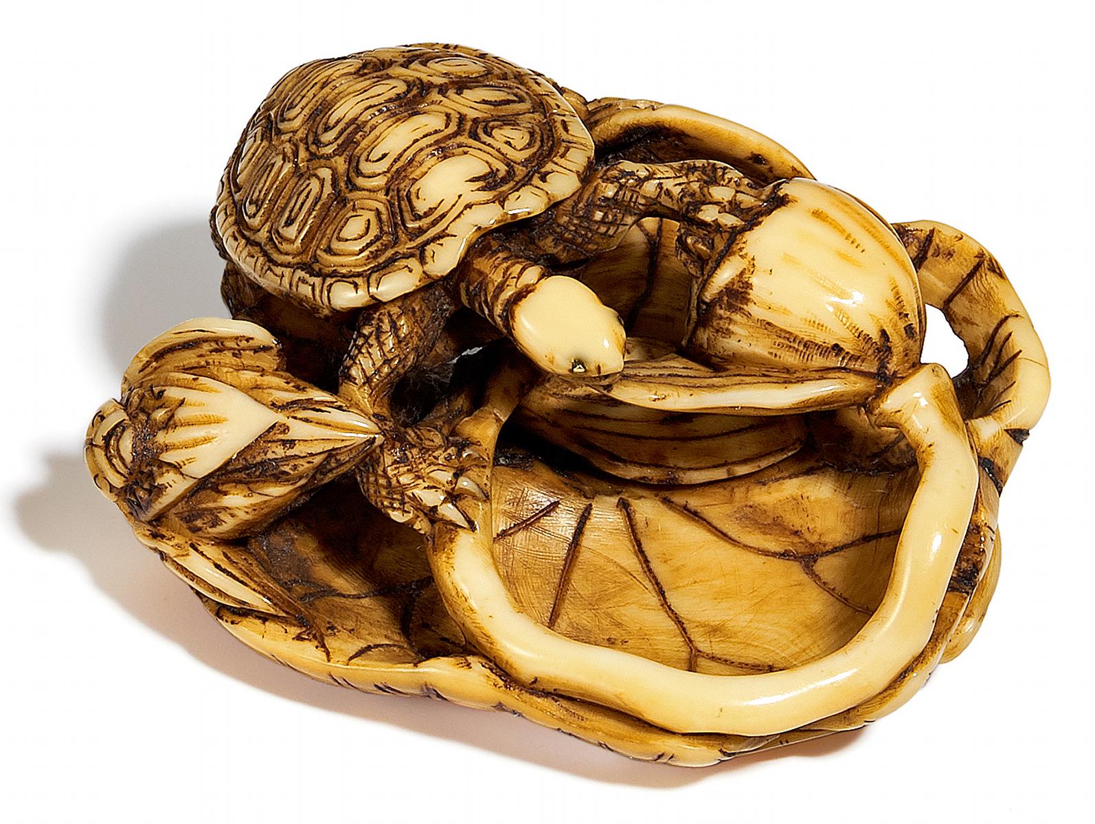 Technik: Pottwalzahn, fein geschnitzt und graviert, teils rötlich-braun akzentuiert, die Augen des Tieres eingelegt aus Gold.