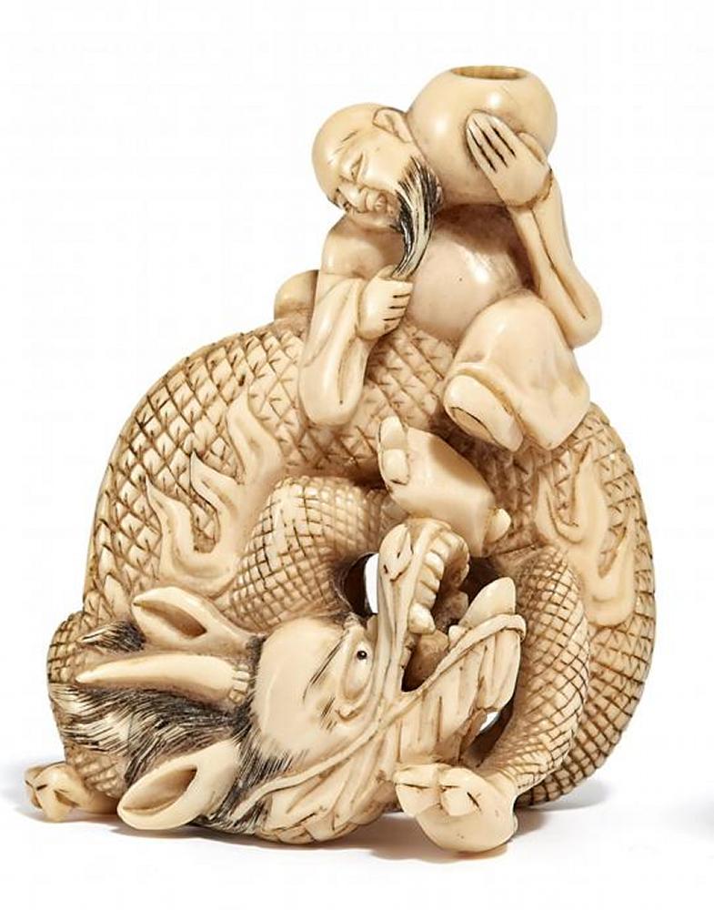 NETSUKE. SENNIN BOMO MIT ALMOSENSCHALE IN DER LINKEN AUF DRACHEN SITZEND. ELFENBEIN.