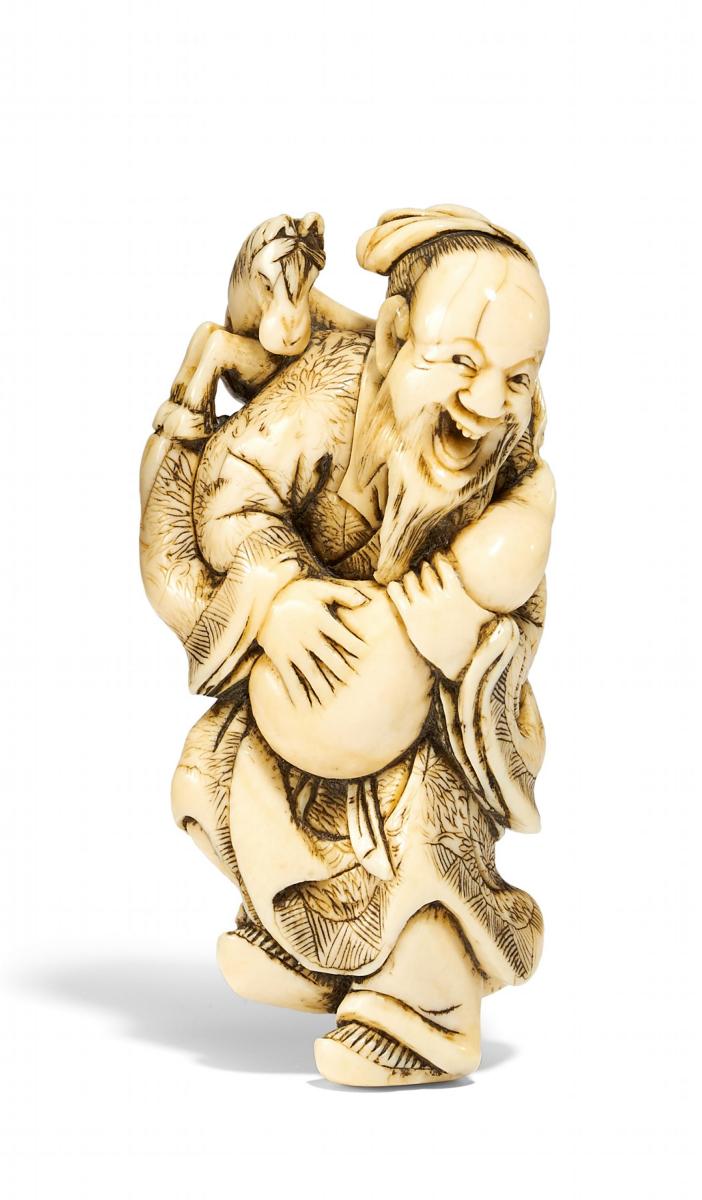 Beschreibung: Tänzerisch bewegte Figur des lachenden Sennin mit riesiger Kalebasse in den Händen, das