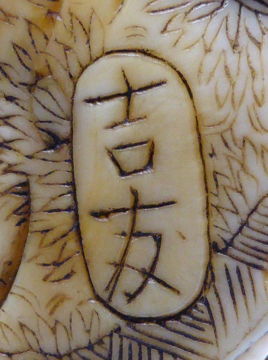 Technik: Elfenbein, fein graviert, goldgelbe Patina.