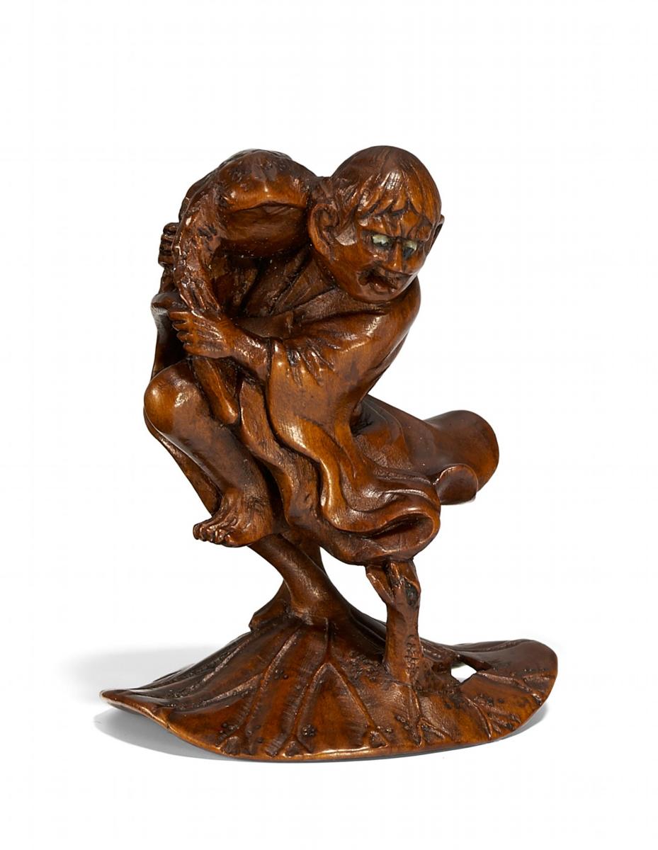 Technik: Hartes, rotbraunes Holz, die Augen des Sennin eingelegt aus hellem Knochen mit schwarzen Pupillen.