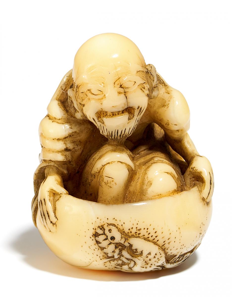 Beschreibung: Der bärtige Sennin, chin. Ursprungs, als alter Mann lächelnd, sitzend in einem Topf,