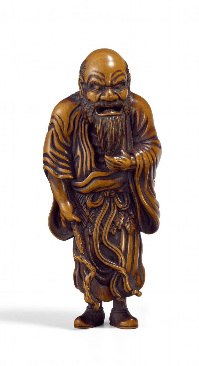 Technik: Buchsbaum, fein geschnitzt und graviert, teils dunkel aktzentuiert. Pupillen eingelegt aus dunklem Horn.
