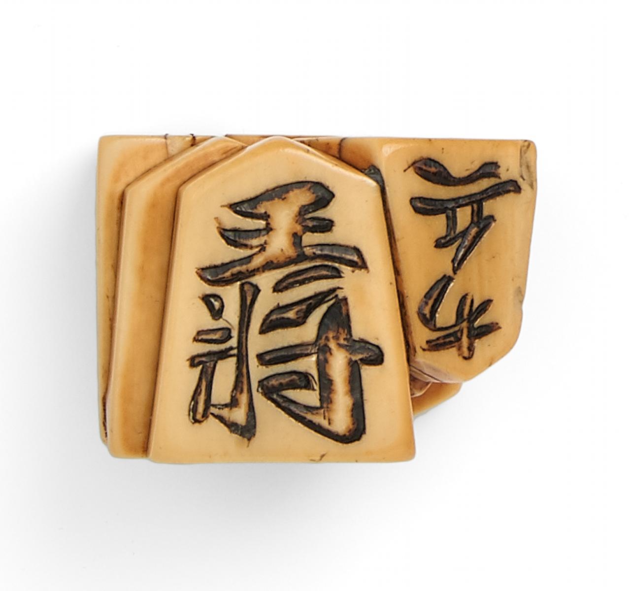NETSUKE. SHÔGI-STEINE. ELFENBEIN. SIGN.: MITSUAKI.