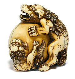 NETSUKE: SHISHI MIT JUNGES UND GROßEM BALL.