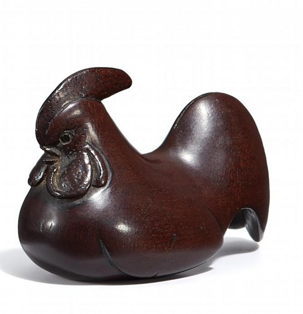 NETSUKE. SITZENDER HAHN, STARK STILISIERT. PFLAUMENHOLZ.