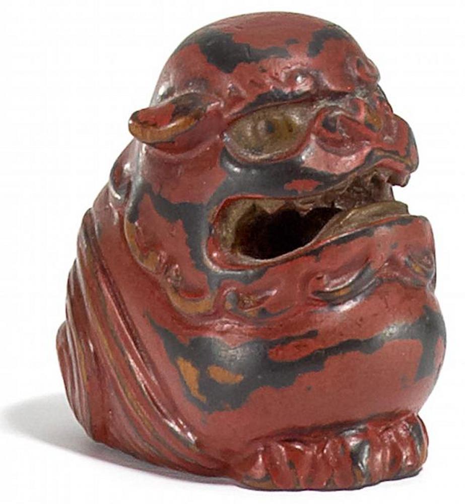 NETSUKE: SITZENDER SHISHI, NEGORO-LACK.