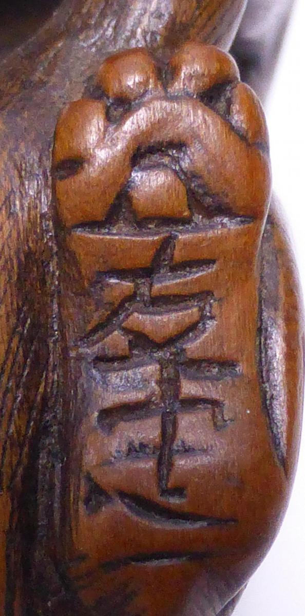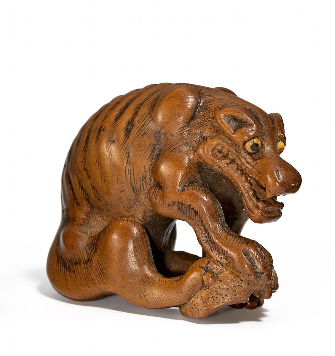 Technik: Buchsbaum, sehr fein graviertes Fell, teils dunkel akzentuiert, die Augen eingelegt aus Bein mit schwarzen Horn-Pupillen.