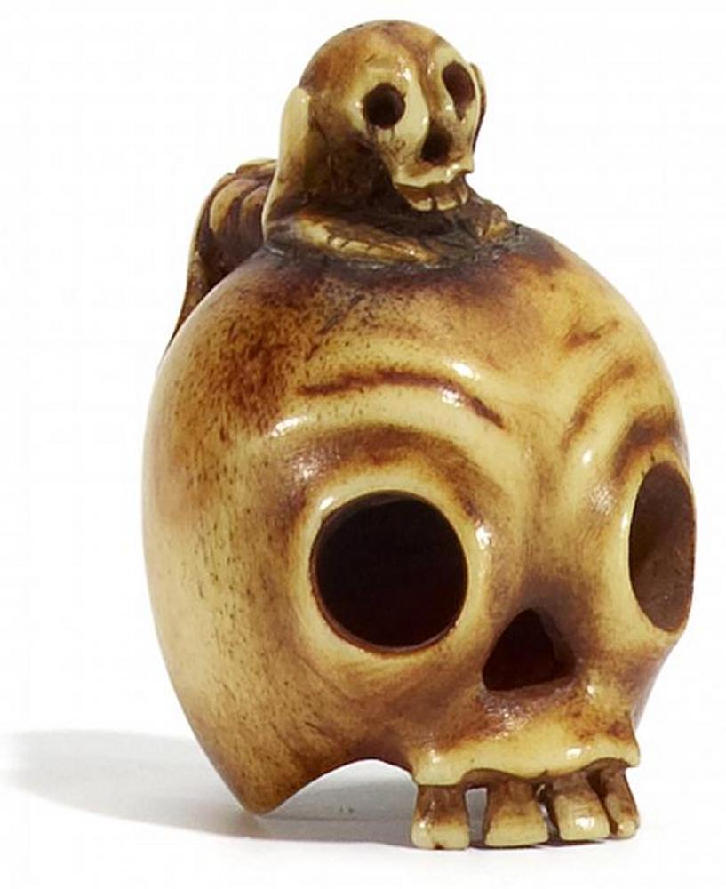 NETSUKE: SKELETT AUF SCHÄDEL, HIRSCHHORN.