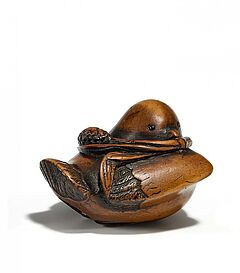 NETSUKE. SPATZ MIT HIRSEZWEIG IM SCHNABEL. ZYPRESSENHOLZ.