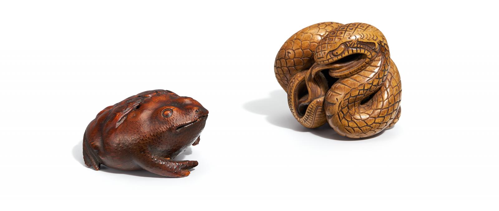 NETSUKE. SPRUNGBEREITE KRÖTE. BAMBUSWURZEL.