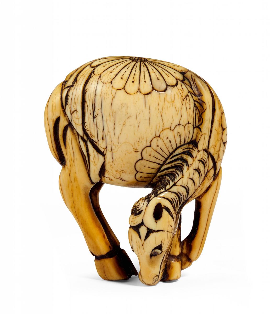 NETSUKE: STEHENDES PFERD MIT CHRYSANTHEMEN VERZIERTER DECKE.