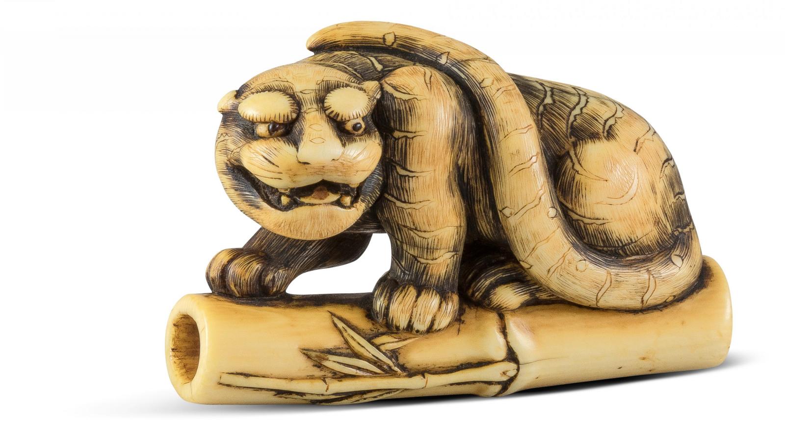 Technik: Elfenbein mit goldgelber Gebrauchspatina, mit fein gravierten und dunkel eingefärbten Details, die Augen eingelegt aus schwarzem Horn.