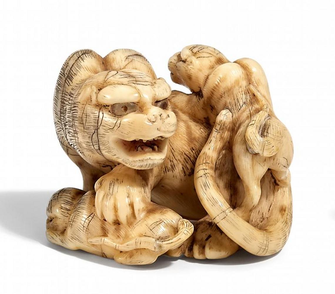 NETSUKE. TIGER MIT JUNGEN. SIGN.: HAKURYÛ.