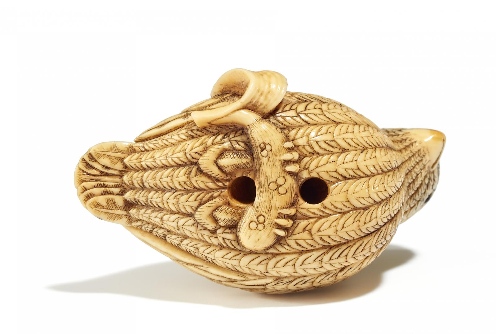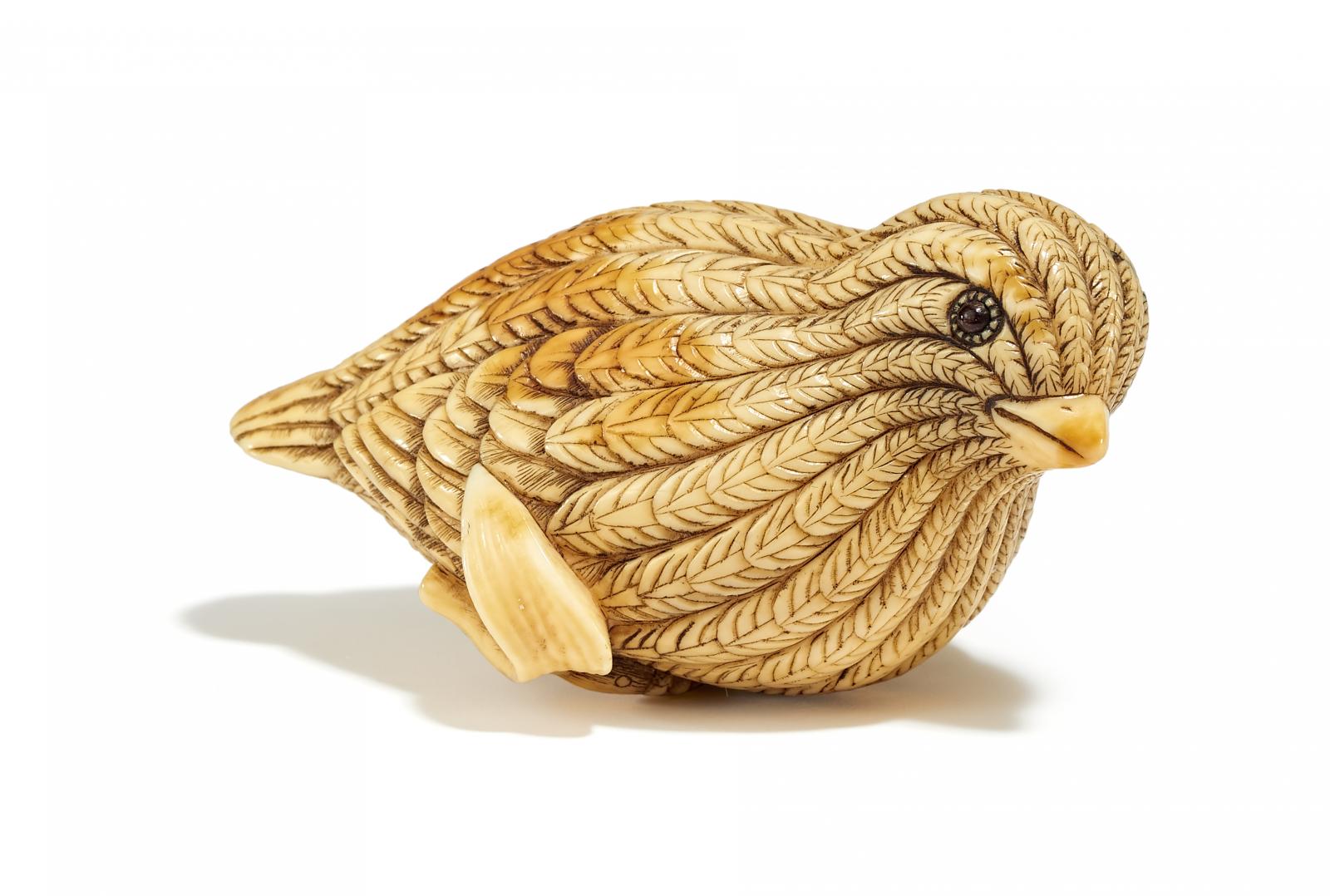 NETSUKE. WACHTEL SITZEND AUF EINEM HIRSEZWEIG. ELFENBEIN. KYÔTO-SCHULE.