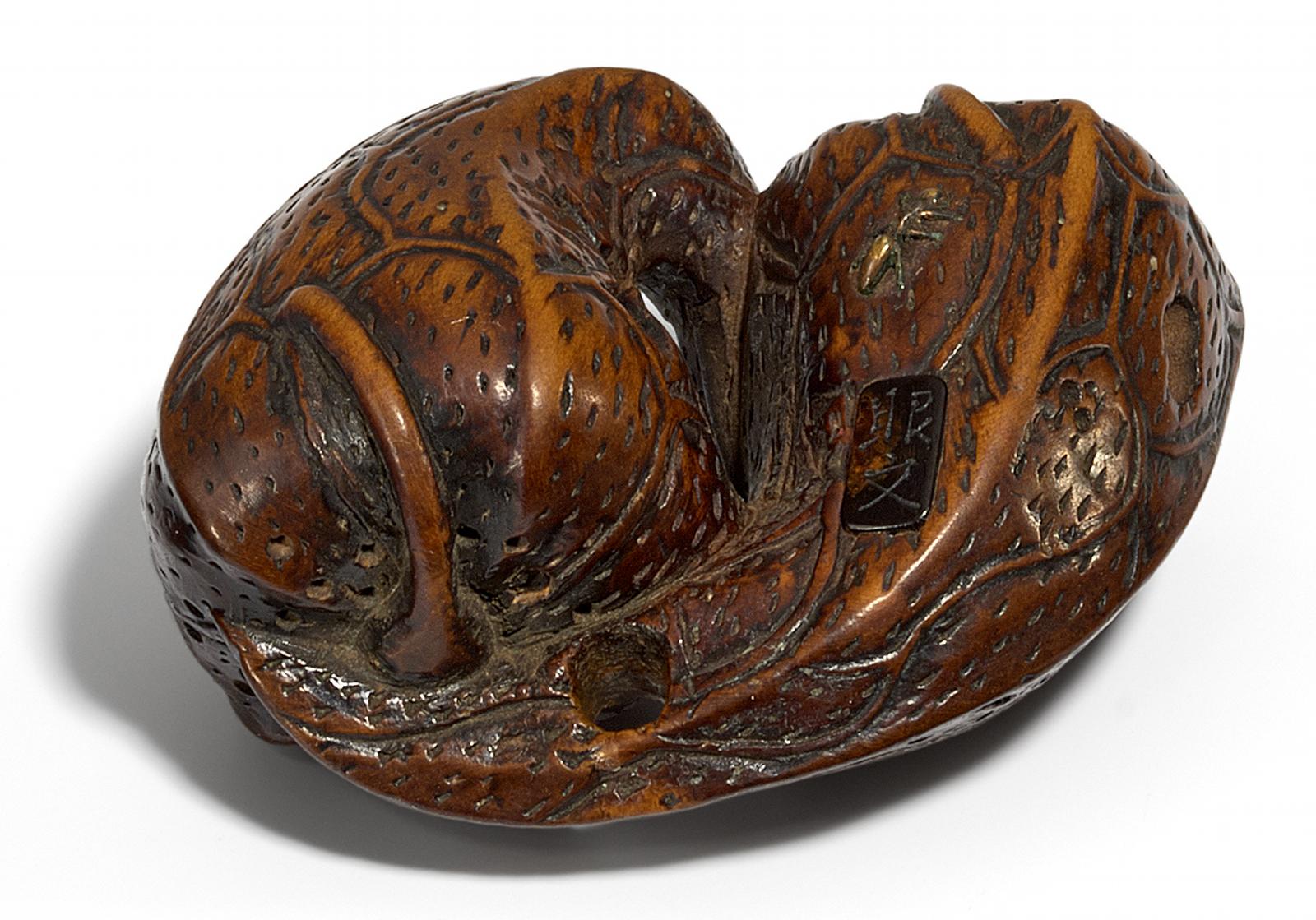 Signatur: Sukeyoshi, auf flach polierter Kartusche, versteckt in der Struktur der Nuss, vgl. MCI S. 830, Eguro Hida Familie.