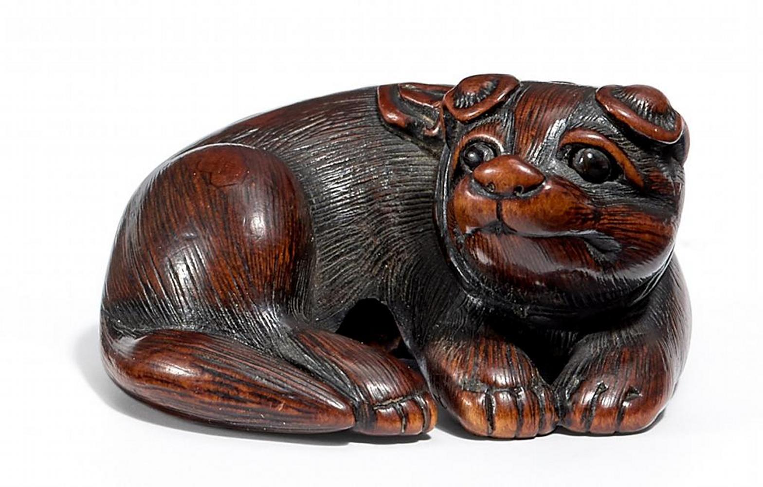 NETSUKE. WELPE MIT BALL. BUCHSBAUM. TOYOMASA STIL.