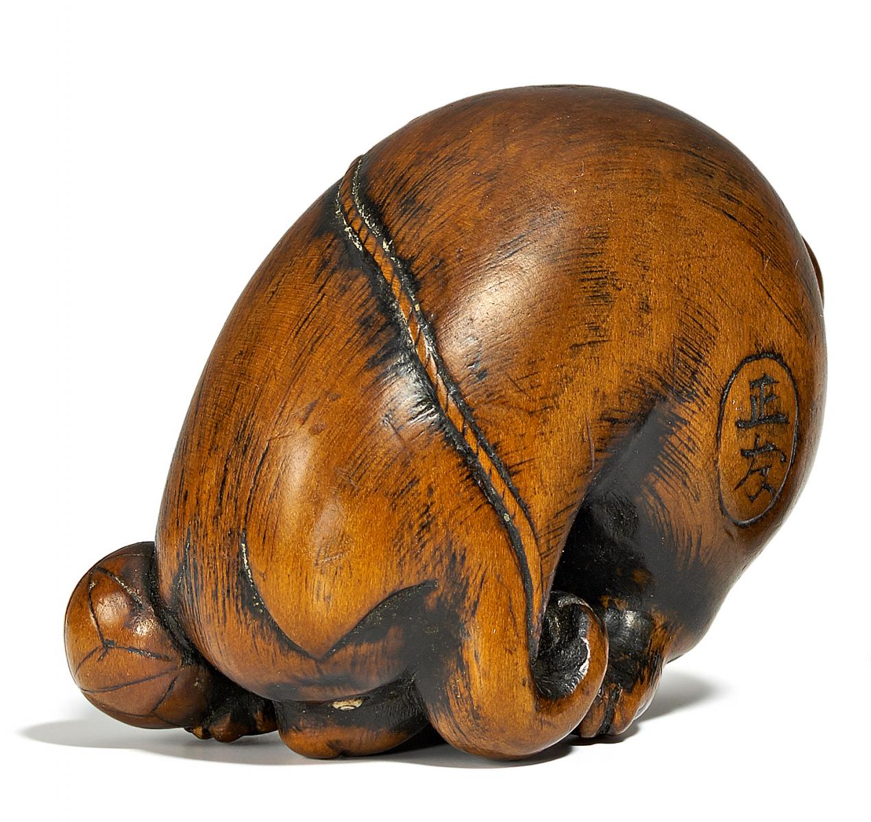 Technik: Buchsbaum mit fein graviertem Fell, fast schwarz patiniert und stark berieben, die Augen eingelegt aus hellem Horn.