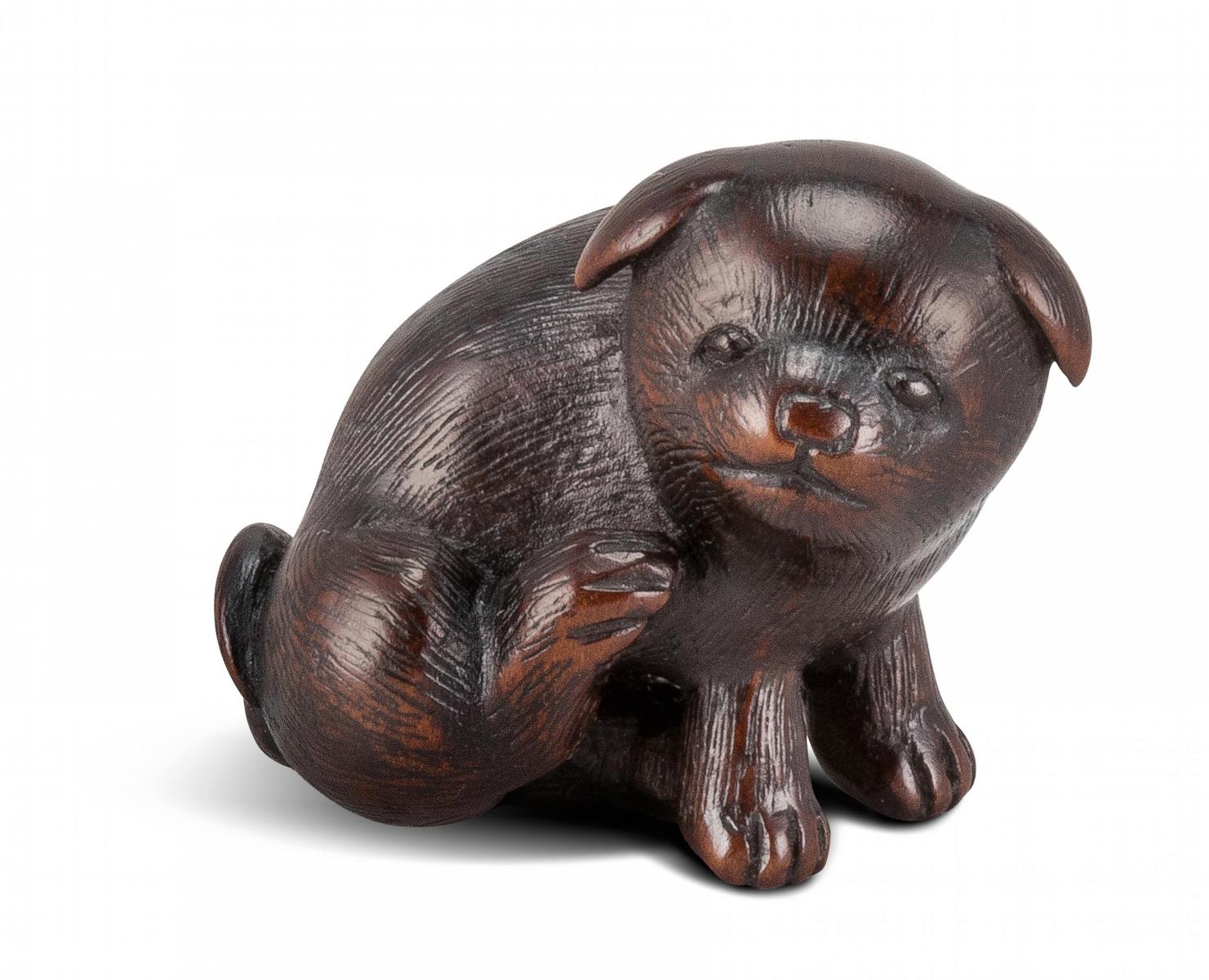 Beschreibung: Sich mit seiner Hinterpfote kratzender Welpe. Natürliche Himotoshi.