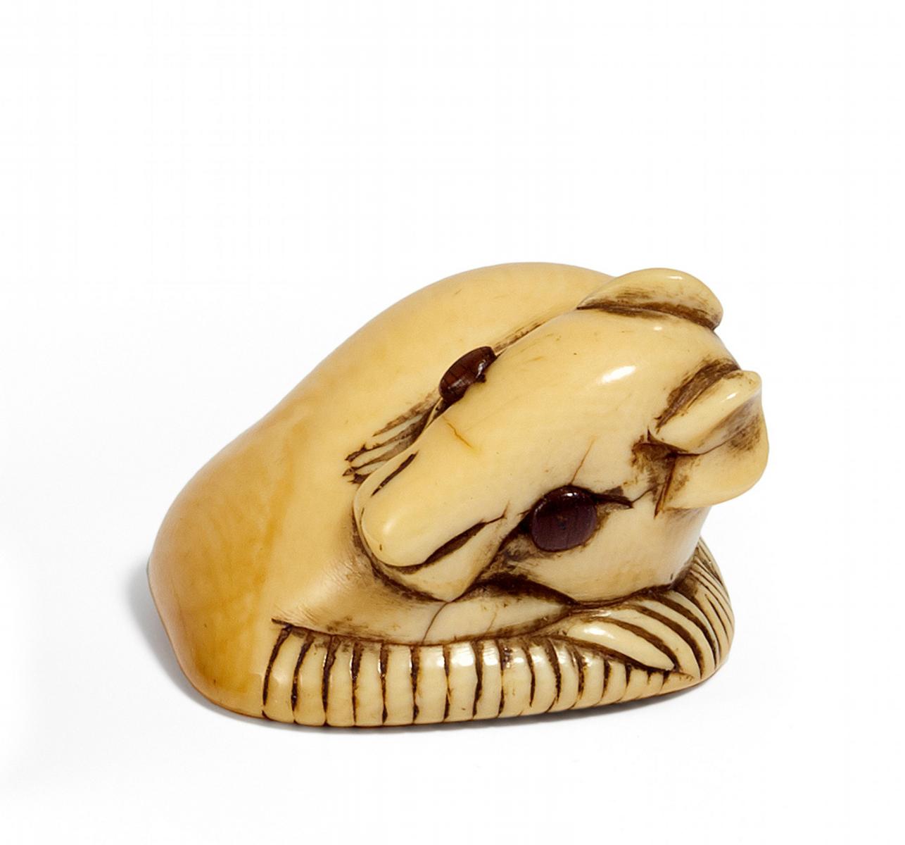 NETSUKE: ZUSAMMENGEROLLTE RATTE.