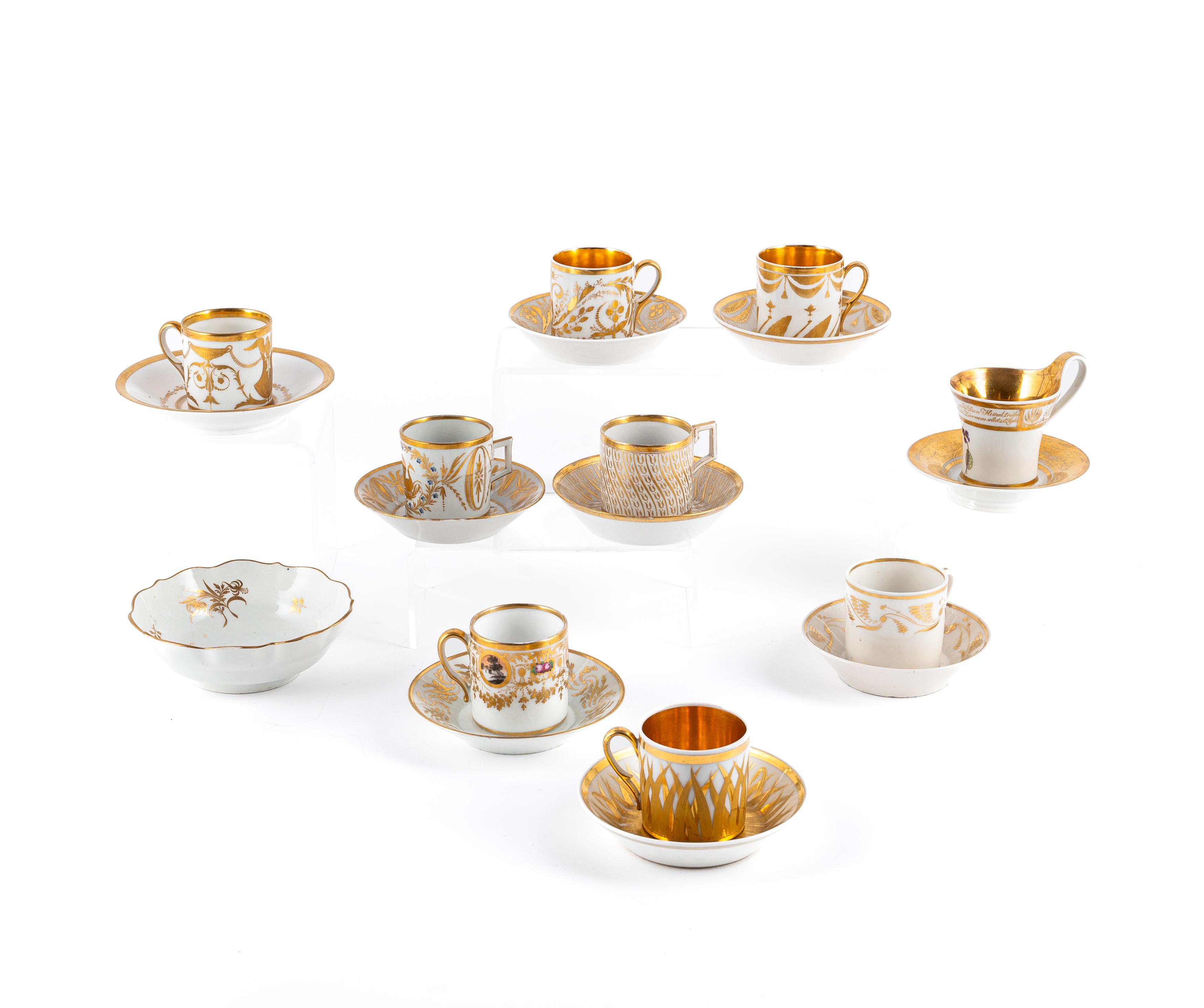 NEUN TASSEN UND UNTERTASSEN UND EINE SCHALE MIT GOLDDEKOREN.