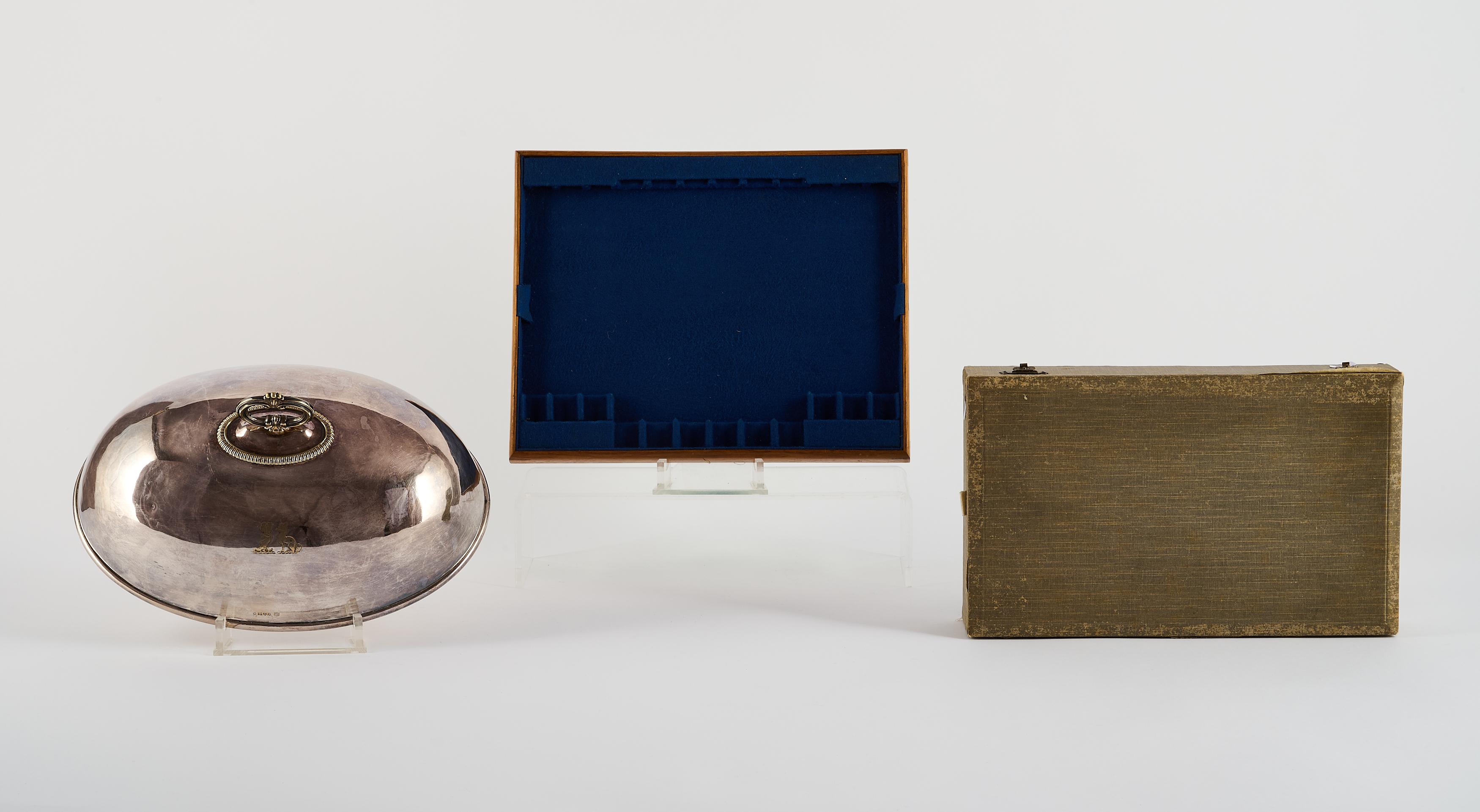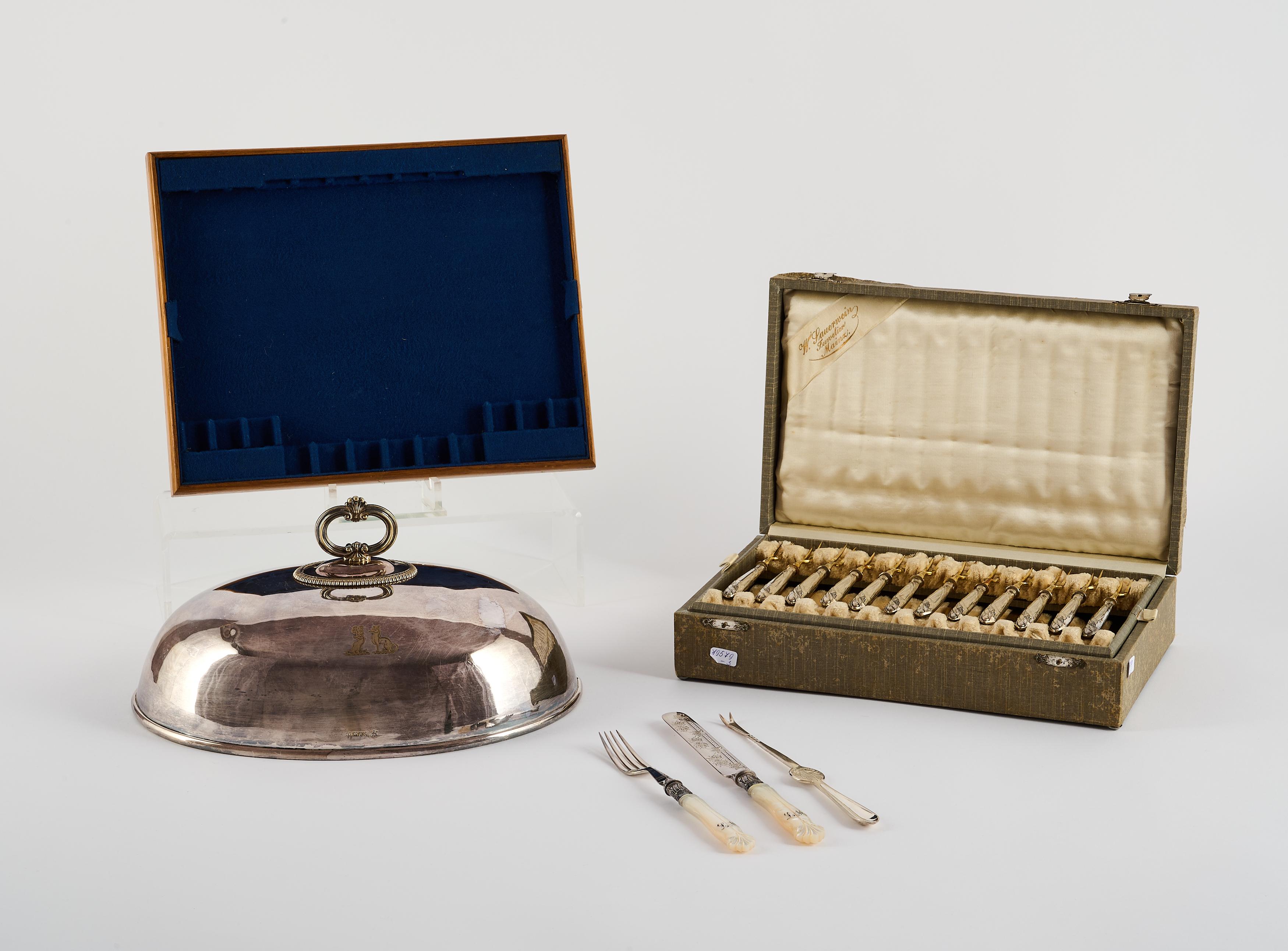 Beilage: 6 Hummergabeln, Warmhalteglocke, Dessertbesteck mit Messer und Gabel für sechs Personen mit Perlmuttgriffen Versilbert .